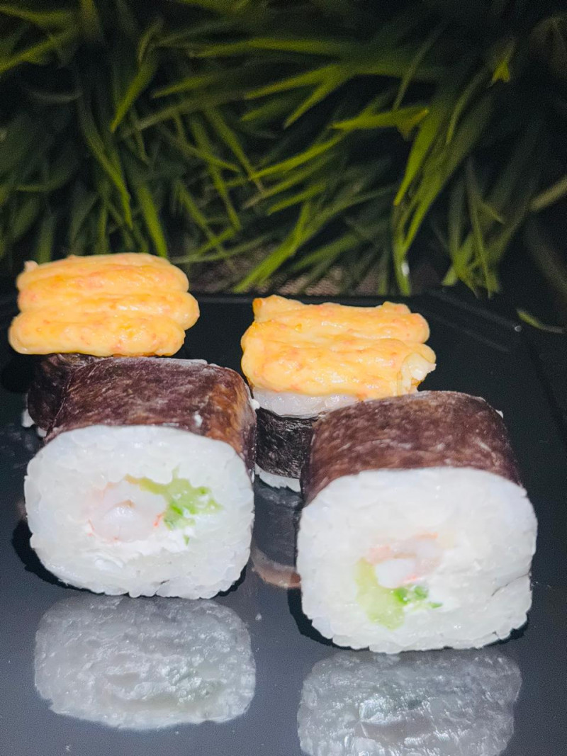 Рис, нори, сыр сливочный, креветка, огурец, соус гринн, унаги, кунжут белый
