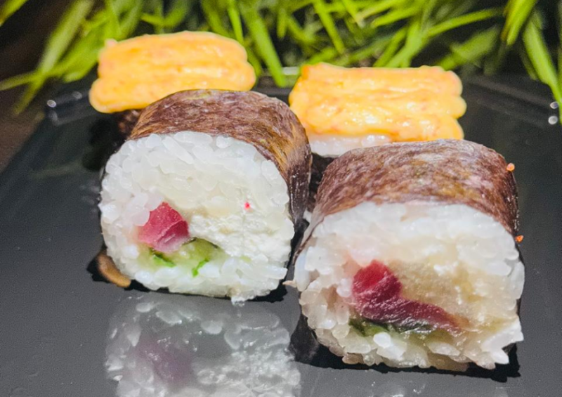 Рис, нори, сливочный сыр, тунец, огурец, соус гринн, унаги, кунжут белый
