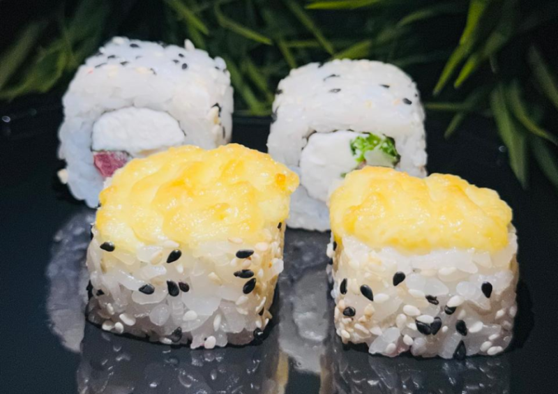 Рис, нори, кунжут ч/б, сыр сливочный, курица, помидор, айсберг, соус сырный, унаги