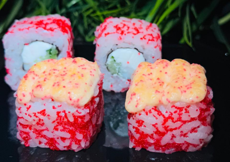 Рис, нори, масаго красная, сыр сливочный, огурец, креветка, соус пикантный, унаги, кунжут белый