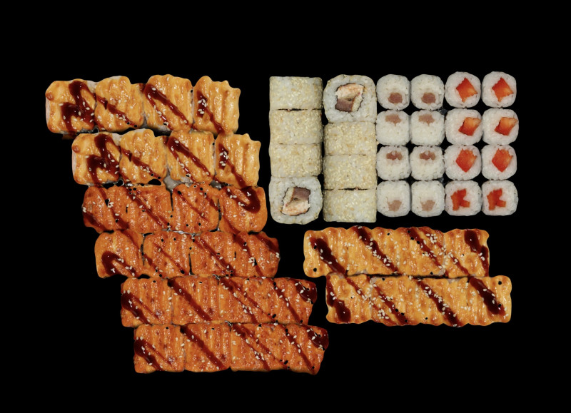 Запеченные роллы: Запеченный с угрем, Острый с креветкой, HOT чикен, Гавайский Роллы: Бонито Классические роллы: Перец, Тунец